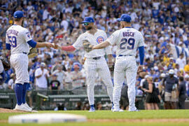 Chicago Cubs celebrate their win over the Pittsburgh Pirates in a baseball game on Sunday, Aug. 17, 2025, at Wrigley Field in Chicago. (AP Photo/Mark Black)