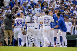 Chicago Cubs celebrate their win over the Pittsburgh Pirates in a baseball game, Sunday, Aug. 17, 2025, at Wrigley Field in Chicago. (AP Photo/Mark Black)