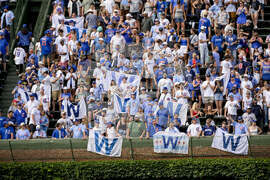 Chicago Cubs fans celebrate their team win over the Pittsburgh Pirates by waving flags in the bleachers of Wrigley Field on Sunday, Aug. 17, 2025, in Chicago. (AP Photo/Mark Black)