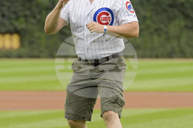 Actor Nick Offermann throws out the ceremonial first pitch before the Chicago Cubs take on the Pittsburgh Pirates, Sunday, Aug. 17, 2025, at Wrigley Field in Chicago. (AP Photo/Mark Black)