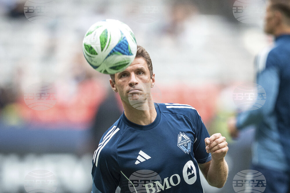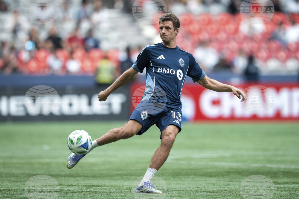 Vancouver Whitecaps' Thomas Muller warms up before an MLS soccer match against the Houston Dynamo in Vancouver, British Columbia, Sunday, Aug. 17, 2025. (Ethan Cairns/The Canadian Press via AP)