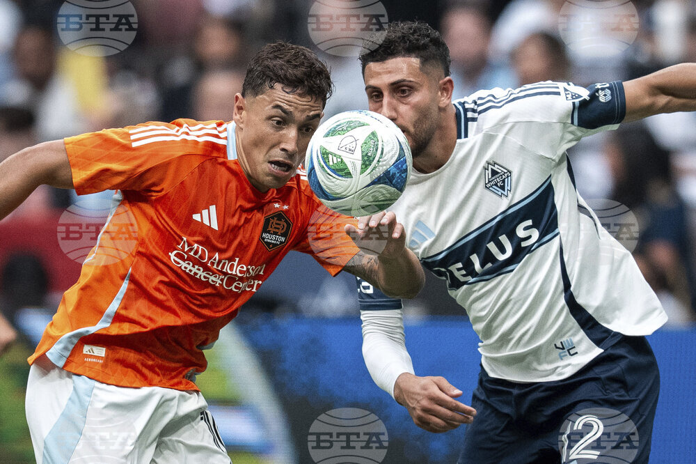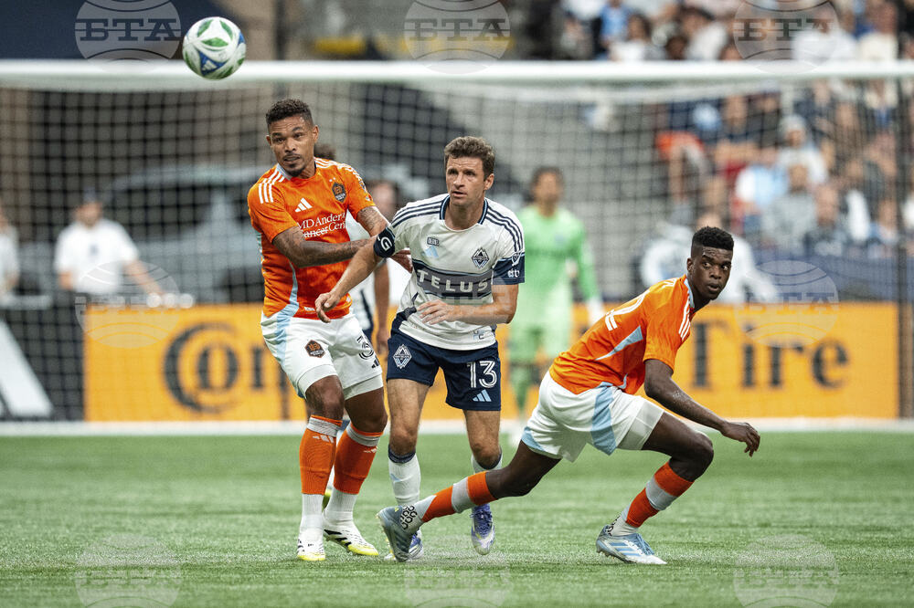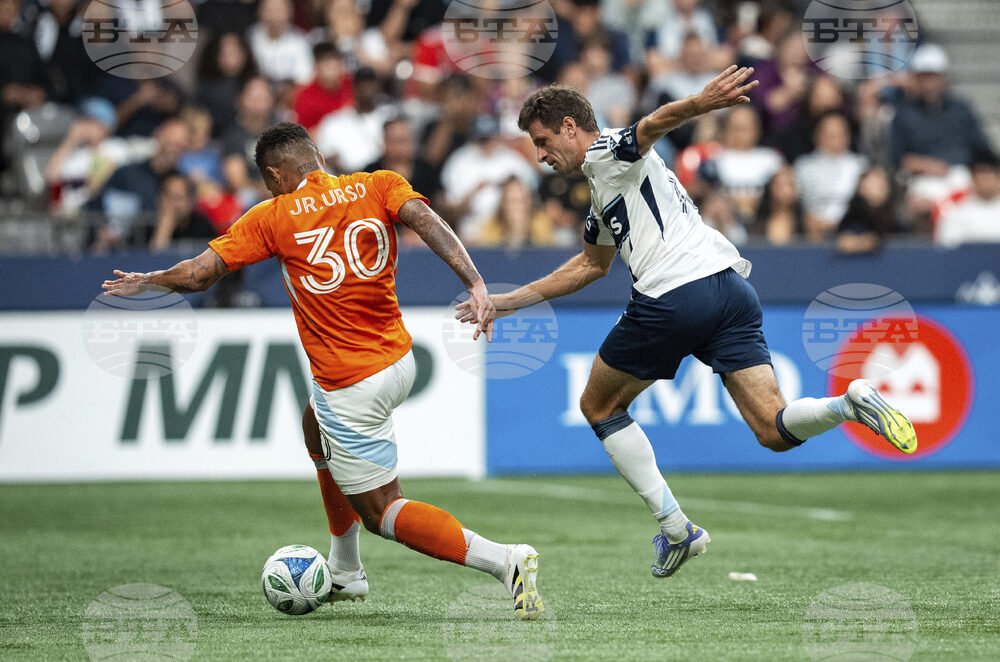 Houston Dynamo's Junior Urso (30) and Vancouver Whitecaps' Thomas Muller vie for the ball during the second half of an MLS soccer match in Vancouver, British Columbia, Sunday, Aug. 17, 2025. (Ethan Cairns/The Canadian Press via AP)