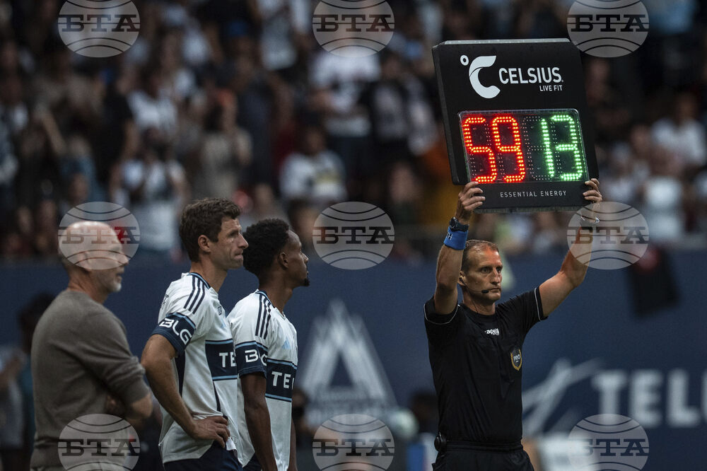Vancouver Whitecaps' Thomas Muller, centre, is subbed in against the Houston Dynamo during the second half of an MLS soccer match in Vancouver, British Columbia, Sunday, Aug. 17, 2025. (Ethan Cairns/The Canadian Press via AP)