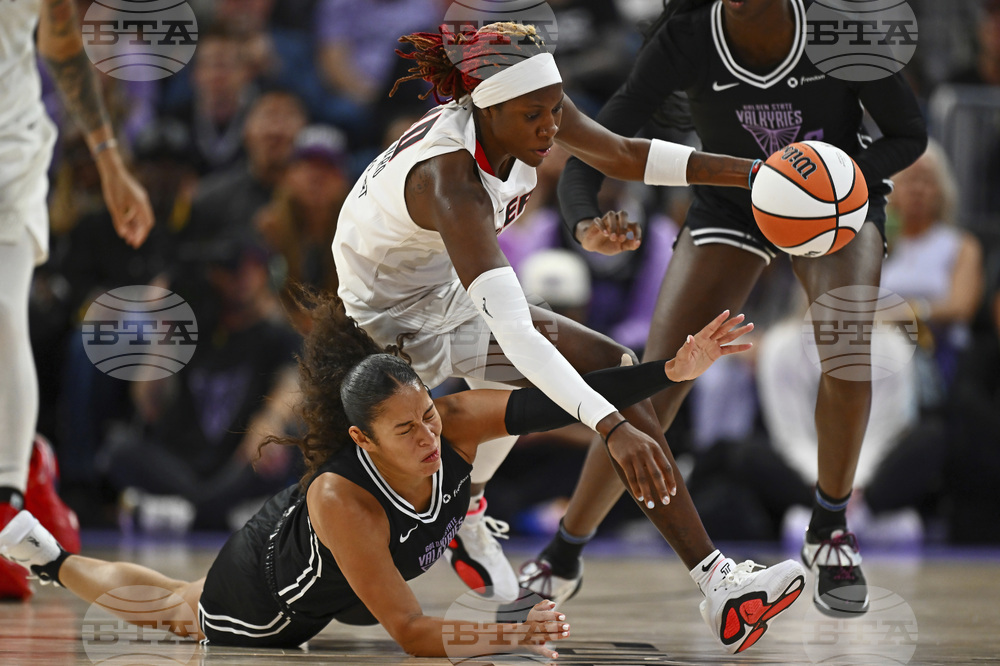 Golden State Valkyries' Veronica Burton tumbles to the ground while battling for a loose ball with Atlanta Dream's Rhyne Howard in the fourth quarter of a WNBA basketball game at Chase Center in San Francisco, Sunday, Aug. 17, 2025. (Carlos Avila Gonzalez/San Francisco Chronicle via AP)
