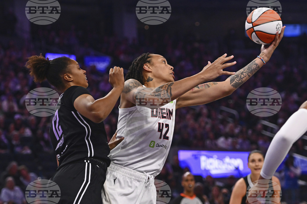 Atlanta Dream's Brittney Griner (42) drives to the basket for a layup against Golden State Valkyries' Iliana Rupert (12) the first half of a WNBA basketball game at Chase Center in San Francisco, Sunday, Aug. 17, 2025. (Carlos Avila Gonzalez/San Francisco Chronicle via AP)