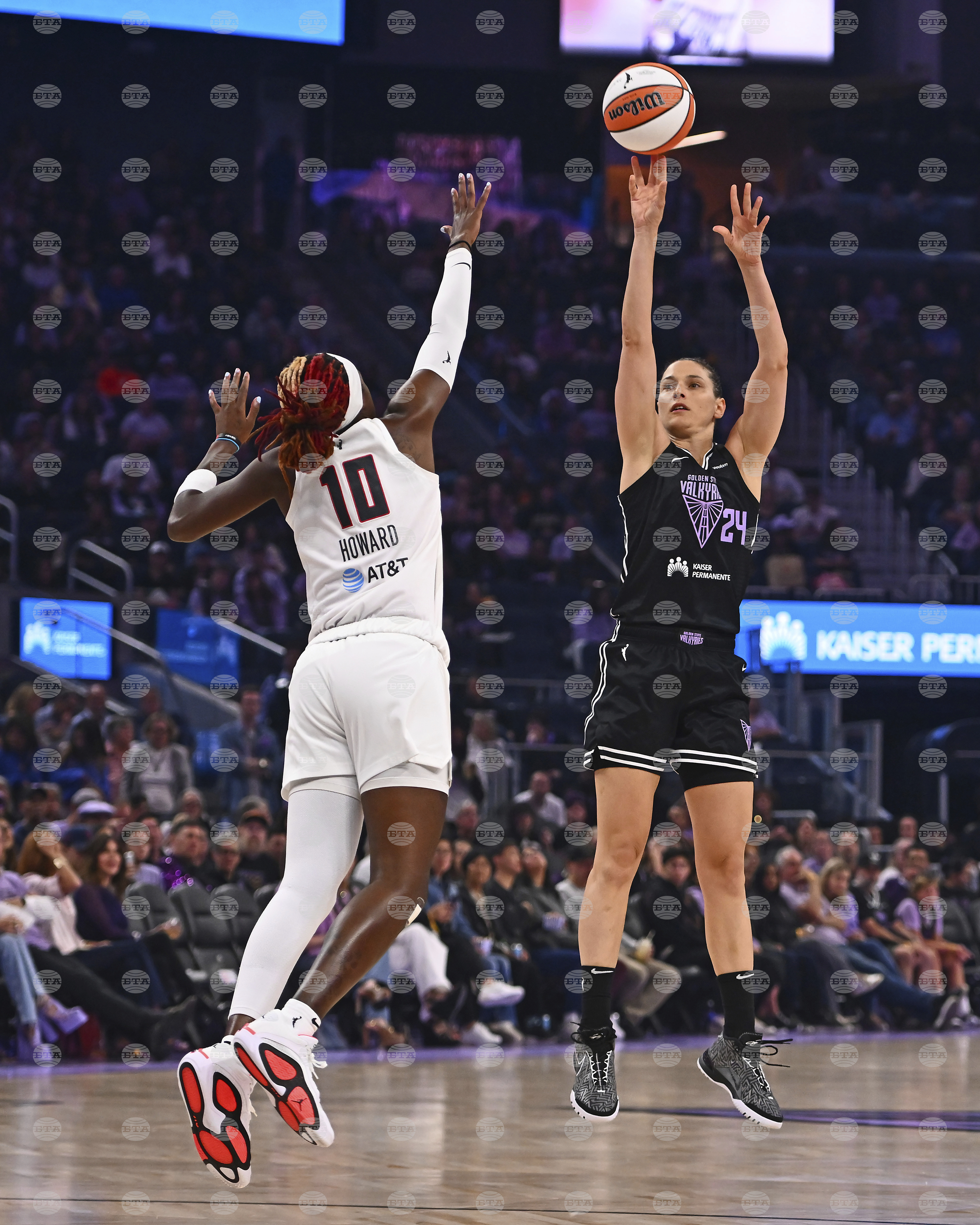 Golden State Valkyries' Cecilia Zandalasini (24) shoots past Atlanta Dream's Rhyne Howard (10) in the first quarter of a WNBA basketball game at Chase Center in San Francisco, Sunday, Aug. 17, 2025. (Jose Carlos Fajardo/Bay Area News Group via AP)