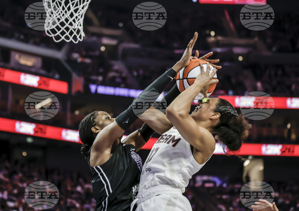 Atlanta Dream's Brittney Griner (42) reaches for a rebound against Golden State Valkyries' Lliana Rupert (12) in the first quarter of a WNBA basketball game at Chase Center in San Francisco, Sunday, Aug. 17, 2025. (Carlos Avila Gonzalez/San Francisco Chronicle via AP)