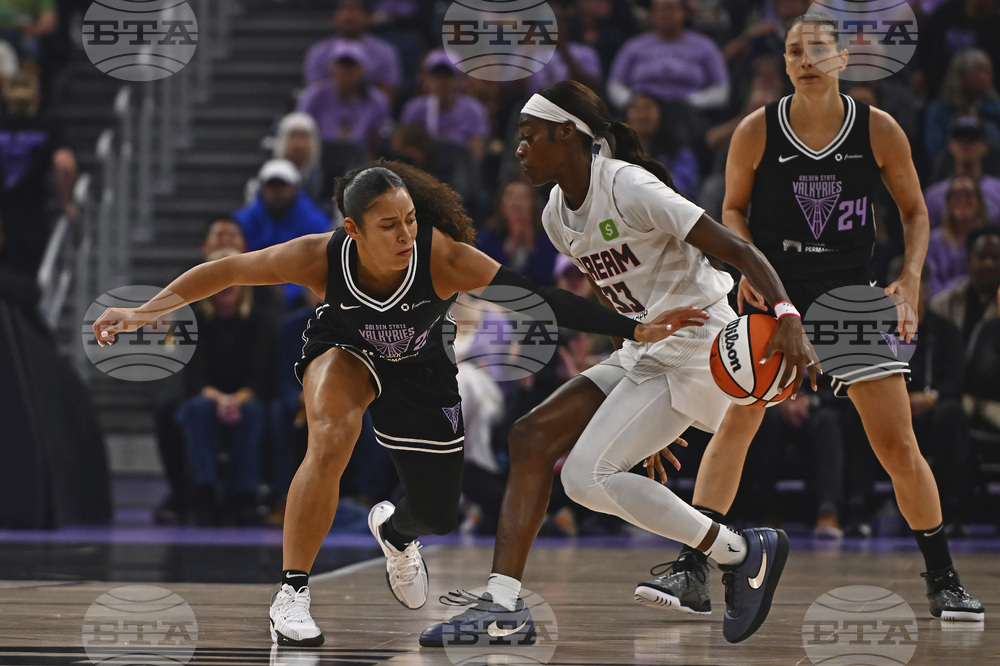 Golden State Valkyries' Veronica Burton attempts to steal the ball from Atlanta Dream's Maya Caldwell (33) in the first quarter of a WNBA basketball game at Chase Center in San Francisco, Sunday, Aug. 17, 2025. (Jose Carlos Fajardo/Bay Area News Group via AP)