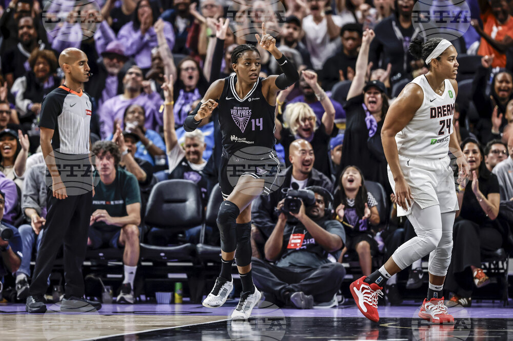Golden State Valkyries' Temi Fágbénlé gestures after scoring against Atlanta Dream in the first half of a WNBA basketball game at Chase Center in San Francisco, Sunday, Aug. 17, 2025. (Carlos Avila Gonzalez/San Francisco Chronicle via AP)