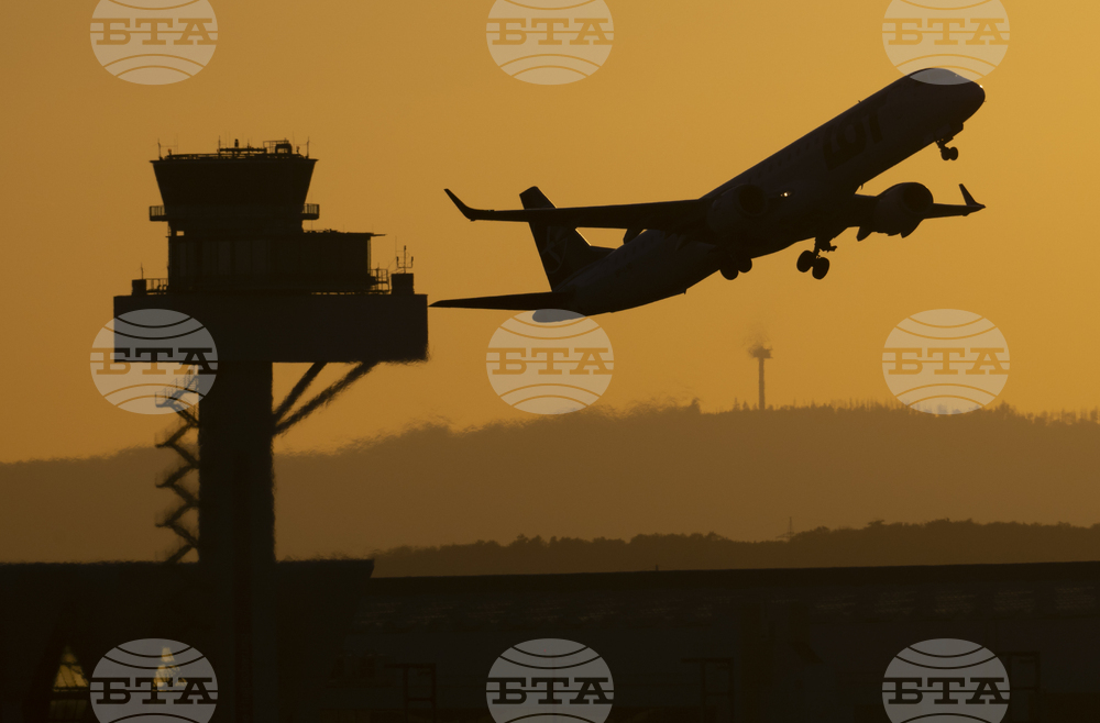 A passenger plane takes off from Frankfurt Airport in the last light of the day, flying past the tower of German Air Traffic Control (DFS), in Frankfurt/Main, Germany, Monday, Aug. 18, 2025. (Boris Roessler/dpa via AP)