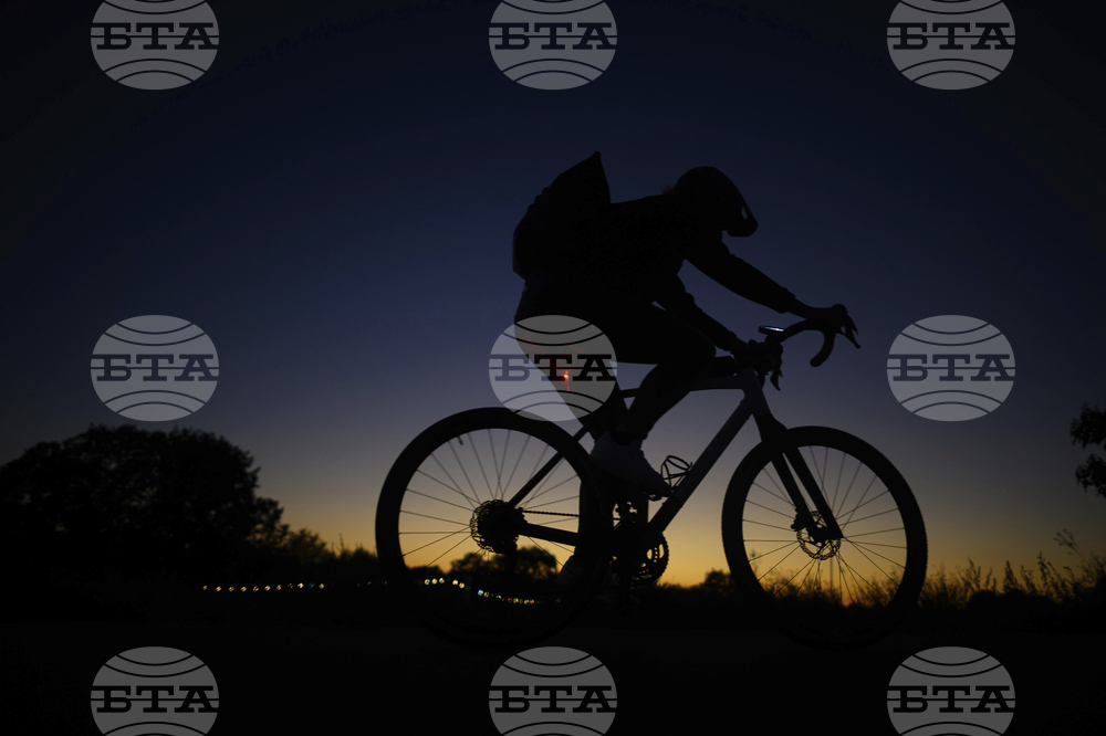 A cyclist is riding along the Elbe cycle path at Hafencity in the evening after sunset, in Dresden, Germany, Monday, Aug. 18, 2025. (Robert Michael/dpa via AP)