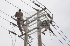 Workers fix electricity cables, previously destroyed during fighting between the Sudanese Armed Forces (SAF) and the paramilitary Rapid Support Forces (RSF), in Khartoum, Sudan, Monday, Aug. 18, 2025. (AP Photo/Marwan Ali)