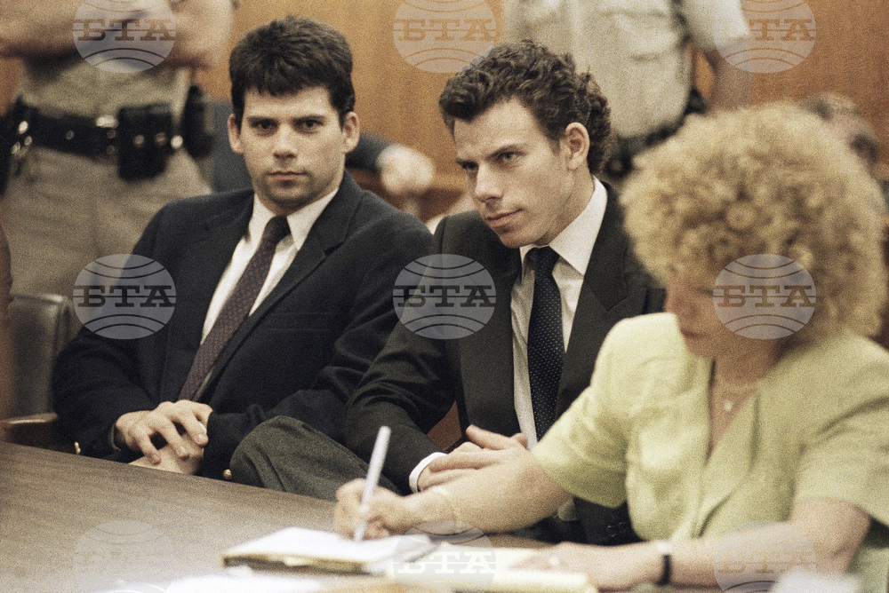 FILE - Lyle, left, and Erik Galen Menendez sit in a Beverly Hills, Calif., courtroom, May 14, 1990. (AP Photo/Kevork Djansezian, File)
