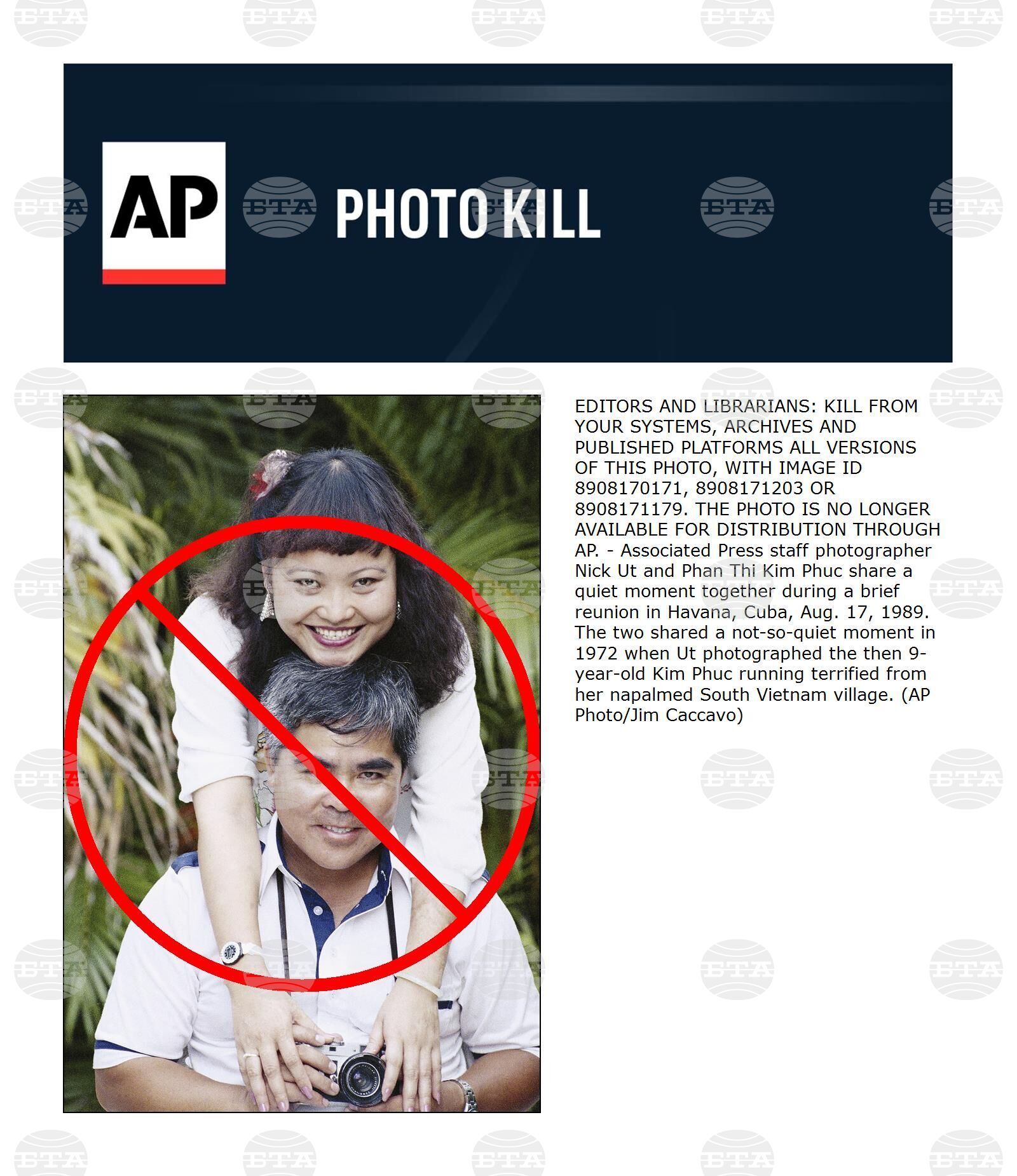 EDITORS AND LIBRARIANS: KILL FROM YOUR SYSTEMS, ARCHIVES AND PUBLISHED PLATFORMS ALL VERSIONS OF THIS PHOTO, WITH IMAGE ID 8908170171, 8908171203 OR 8908171179. THE PHOTO IS NO LONGER AVAILABLE FOR DISTRIBUTION THROUGH AP. - Associated Press staff photographer Nick Ut and Phan Thi Kim Phuc share a quiet moment together during a brief reunion in Havana, Cuba, Aug. 17, 1989. The two shared a not-so-quiet moment in 1972 when Ut photographed the then 9-year-old Kim Phuc running terrified from her napalmed South Vietnam village. (AP Photo/Jim Caccavo)