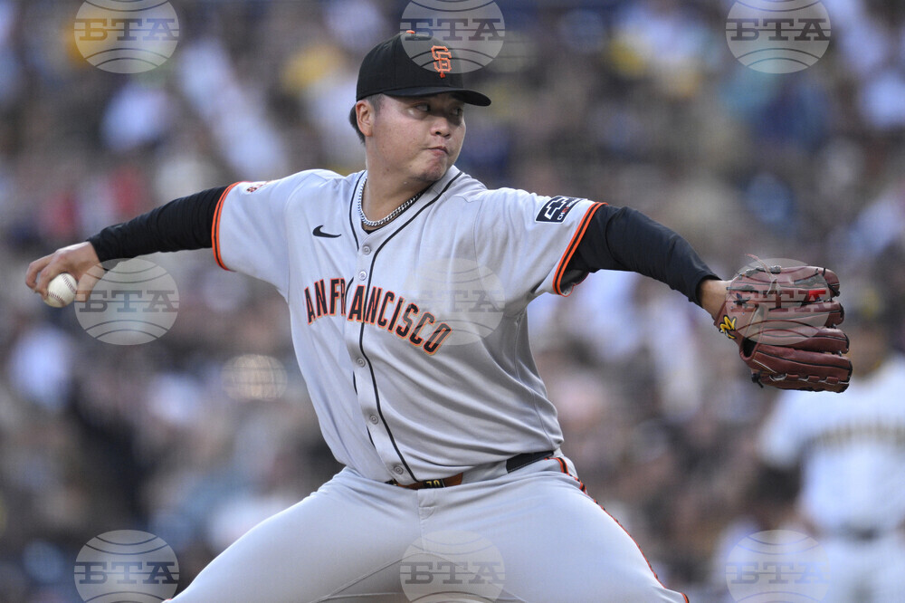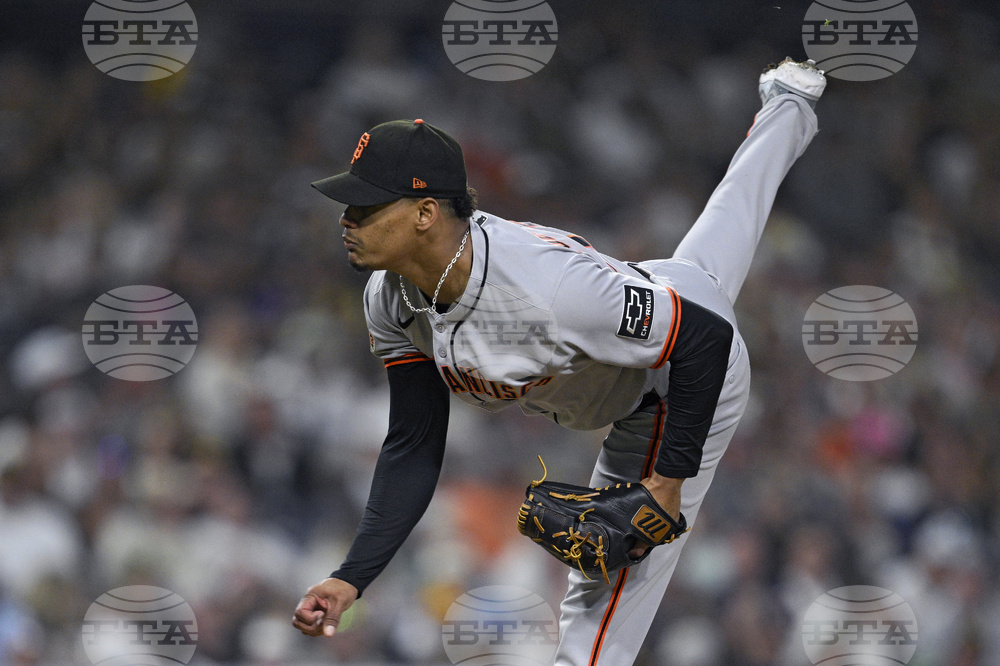 San Francisco Giants starting pitcher Kai-Wei Teng works against a San Diego Padres batter during the first inning of a baseball game Tuesday, Aug. 19, 2025, in San Diego. (AP Photo/Orlando Ramirez)