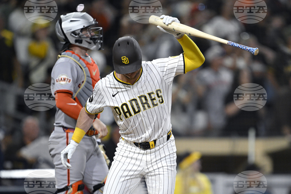 San Diego Padres' Jake Cronenworth reacts after being hit by a pitch during the fifth inning of a baseball game against the San Francisco Giants Monday, Aug 18, 2025, in San Diego. (AP Photo/Orlando Ramirez)