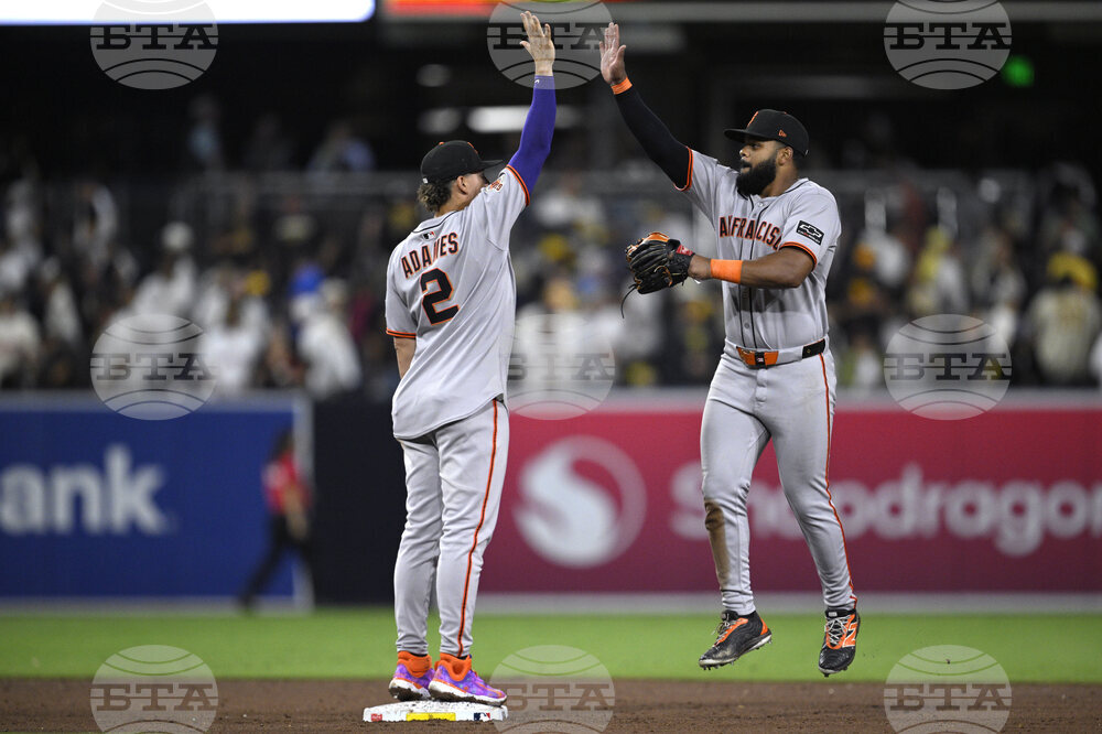 San Francisco Giants' Patrick Bailey, left, and Randy Rodriguez celebrate after defeating the San Diego Padres in a baseball game Monday, Aug. 18, 2025, in San Diego. (AP Photo/Orlando Ramirez)