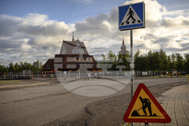Construction signs are placed outside the Kiruna Church, a Sami style wooden Swedish Lutheran church, called Kiruna Kyrka in Swedish, in Kiruna, Sweden, Saturday, Aug. 16, 2025, a day before it will be moved along a 5-kilometer (3-mile) route east to a new city center as part of the town's relocation.(AP Photo/Malin Haarala)