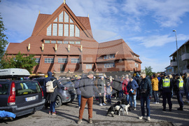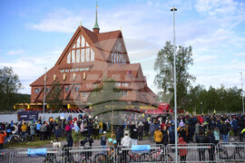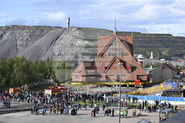 People gather outside the Kiruna Church, a Sami style wooden Swedish Lutheran church, called Kiruna Kyrka in Swedish, in Kiruna, Sweden, Tuesday, Aug. 19, 2025, as it is being moved along a 5-kilometer (3-mile) route east to a new city center as part of the town's relocation. (AP Photo/Malin Haarala)
