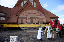 On a specially designed trolley with 224 wheels, Kiruna Church is being moved at a speed of half a kilometre per hour, in Kiruna, Sweden, Tuesday Aug. 19, 2025. (Fredrik Sandberg/TT News Agency via AP)