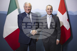 Swiss Federal Councillor and Foreign Minister Ignazio Cassis, right, and Italy's Deputy Prime Minister and Foreign Minister Antonio Tajani shake hands during an official visit in Bern, Switzerland, Tuesday, Aug. 19, 2025. (Peter Klaunzer/Keystone via AP)