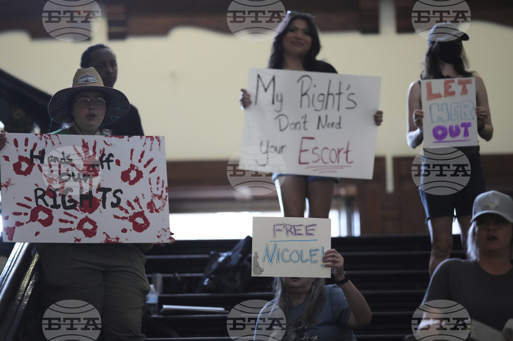 Protesters gather outside of the House Chamber where Democratic Texas state Rep. Nicole Collier refuses to leave due to a required law enforcement escort, Tuesday, Aug. 19, 2025, in Austin, Texas. (AP Photo/Eric Gay)