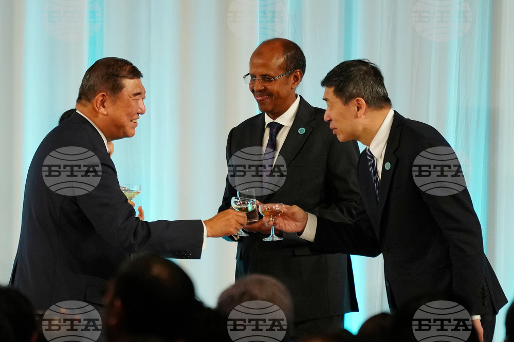 Japanese Prime Minister Shigeru Ishiba, left, and Acting Administrator of the United Nations Development Programme (UNDP) Xu Haoliang, right, clink glasses near African Union Commission Chairperson Mahamoud Ali Youssouf during a welcome reception of the Ninth Tokyo International Conference on African Development (TICAD 9) in Yokohama, near Tokyo, Wednesday, Aug. 20, 2025. (Xinhua/Jia Haocheng)