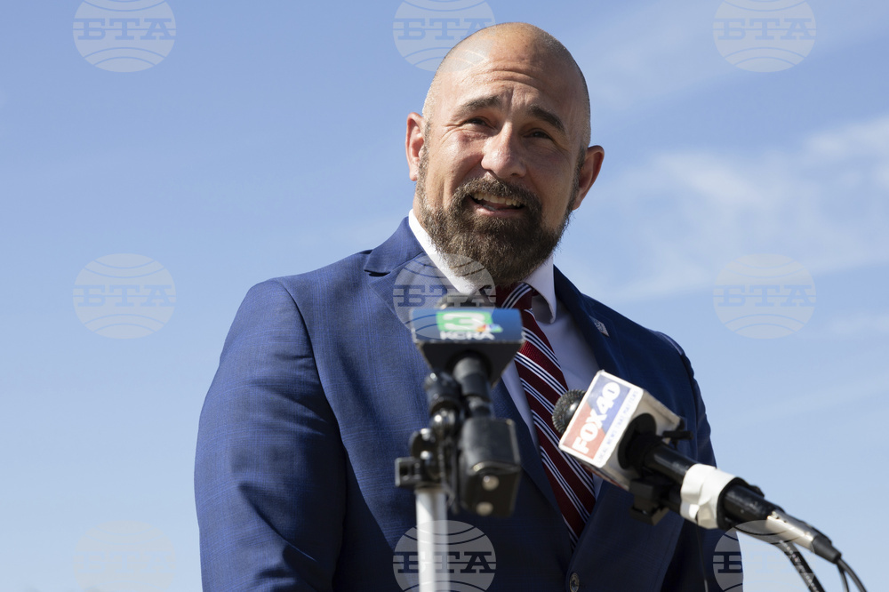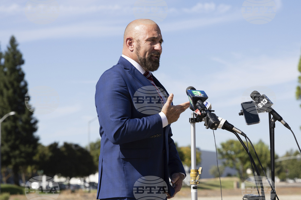 Florida Lt. Gov. Jay Collins makes remarks at a press conference on Thursday, Aug. 21, 2025, in Stockton, Calif.(AP Photo/Benjamin Fanjoy)