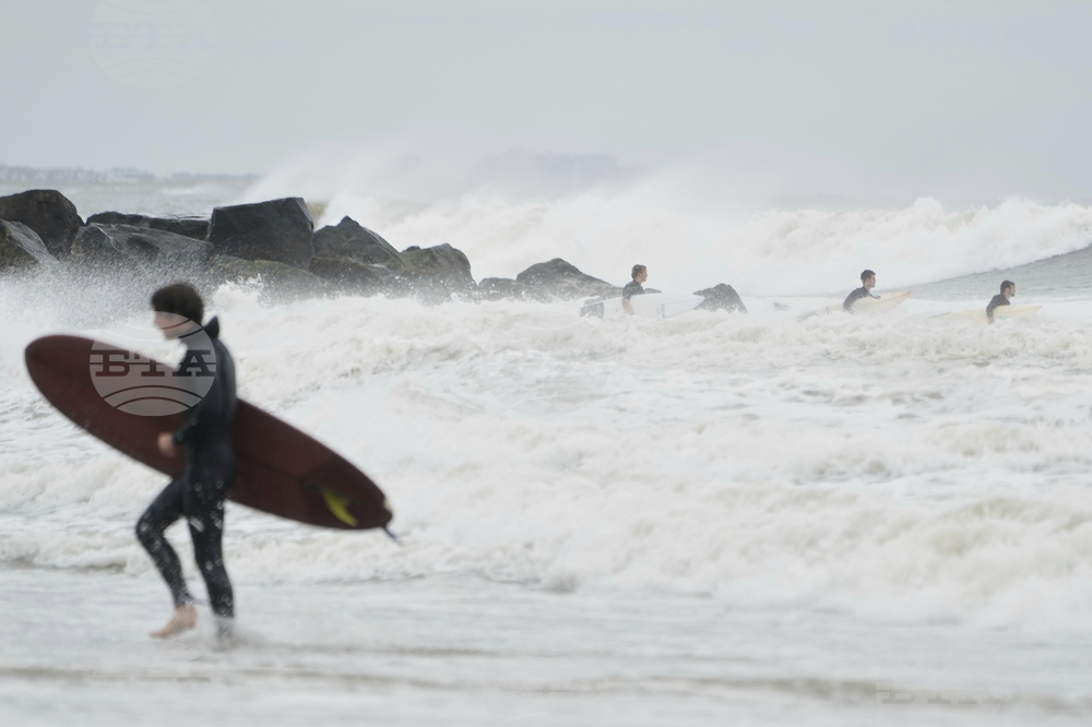 Surfers ride waves bolstered by Hurricane Erin at Rockaway Beach in the Queens borough of New York, Thursday, Aug. 21, 2025. (AP Photo/Seth Wenig)