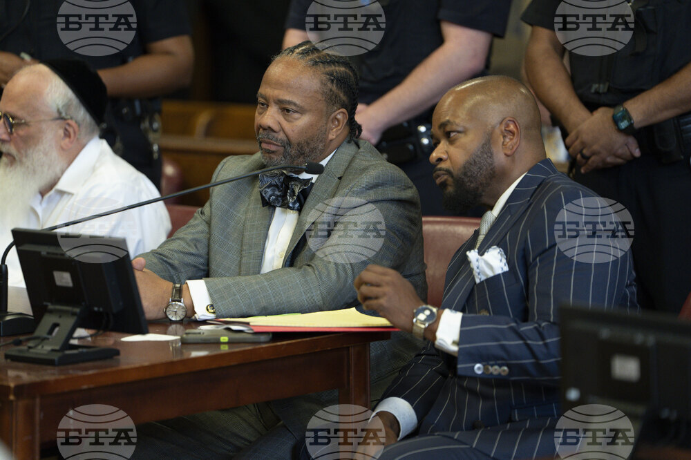 Former state Sen. Jesse Hamilton, center, and real estate developer Yechiel Landau, left, appear for corruption charges in Manhattan Supreme Court in New York, Thursday, Aug. 21, 2025. (Curtis Means/Pool Photo via AP)