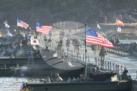 FILE - Flags of South Korea and the United States flutter before a joint river-crossing drill between South Korea and the United States in Yeoju, South Korea, Friday, Oct. 20, 2023. (AP Photo/Ahn Young-joon, File)