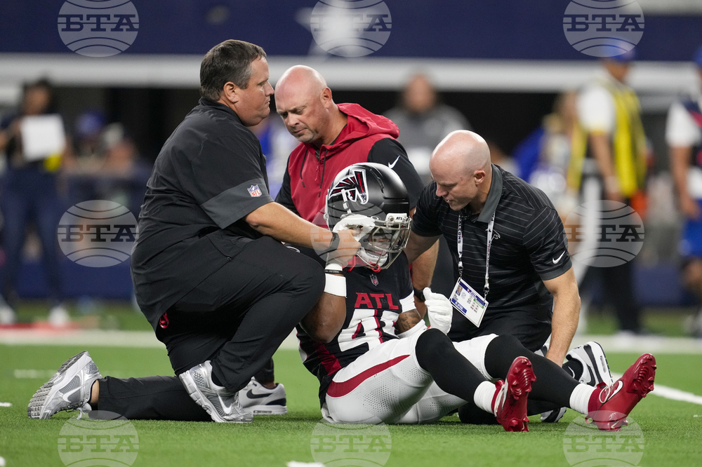 Atlanta Falcons safety Josh Thompson is tended to by medical staff during the first half of a preseason NFL football game against the Dallas Cowboys Friday, Aug. 22, 2025, in Arlington, Texas. (AP Photo/Tony Gutierrez)