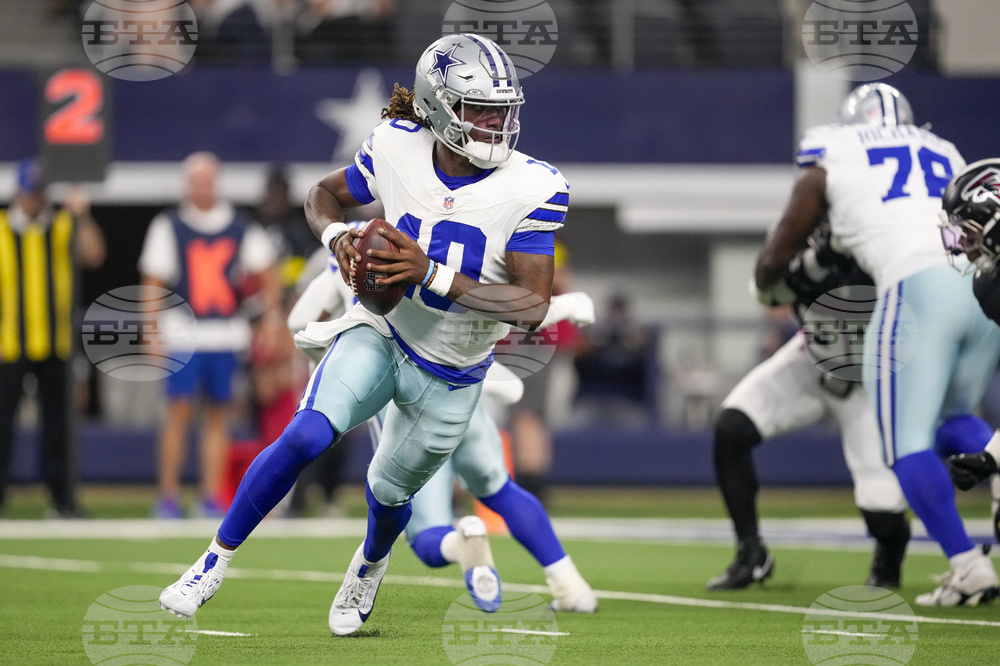Dallas Cowboys quarterback Joe Milton III looks to pass against the Atlanta Falcons during the first half of a preseason NFL football game Friday, Aug. 22, 2025, in Arlington, Texas. (AP Photo/Tony Gutierrez)