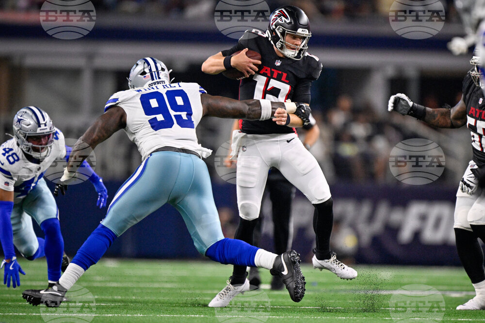 Atlanta Falcons quarterback Easton Stick, right, avoids a hit by Dallas Cowboys defensive tackle Perrion Winfrey (99) during the first half of a preseason NFL football game Friday, Aug. 22, 2025, in Arlington, Texas. (AP Photo/Jerome Miron)