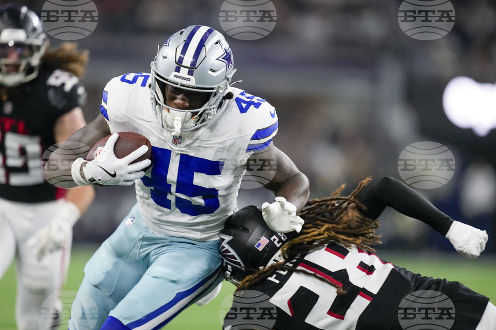 Atlanta Falcons running back Elijah Dotson (41) is brought down by Dallas Cowboys cornerback Michael Ojemudia (42) and defensive tackle Tommy Akingbesote (92) during the first half of a preseason NFL football game Friday, Aug. 22, 2025, in Arlington, Texas. (AP Photo/Gareth Patterson)