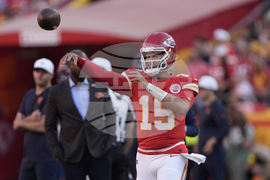 Kansas City Chiefs quarterback Patrick Mahomes warms up before a preseason NFL football game against the Chicago Bears Friday, Aug. 22, 2025, in Kansas City, Mo. (AP Photo/Charlie Riedel)