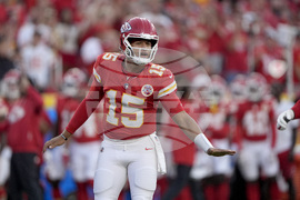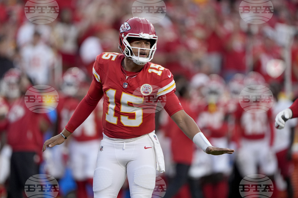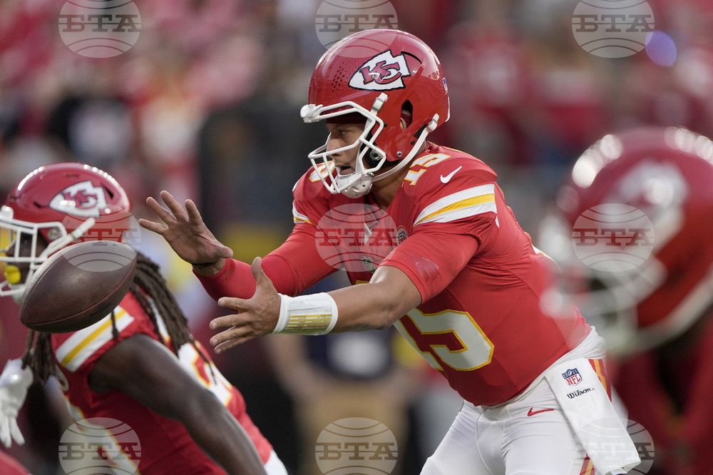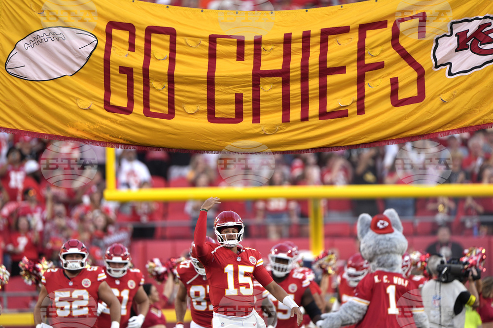 Kansas City Chiefs quarterback Patrick Mahomes (15) is introduced with the rest of the team before a preseason NFL football game against the Chicago Bears Friday, Aug. 22, 2025, in Kansas City, Mo. (AP Photo/Charlie Riedel)
