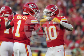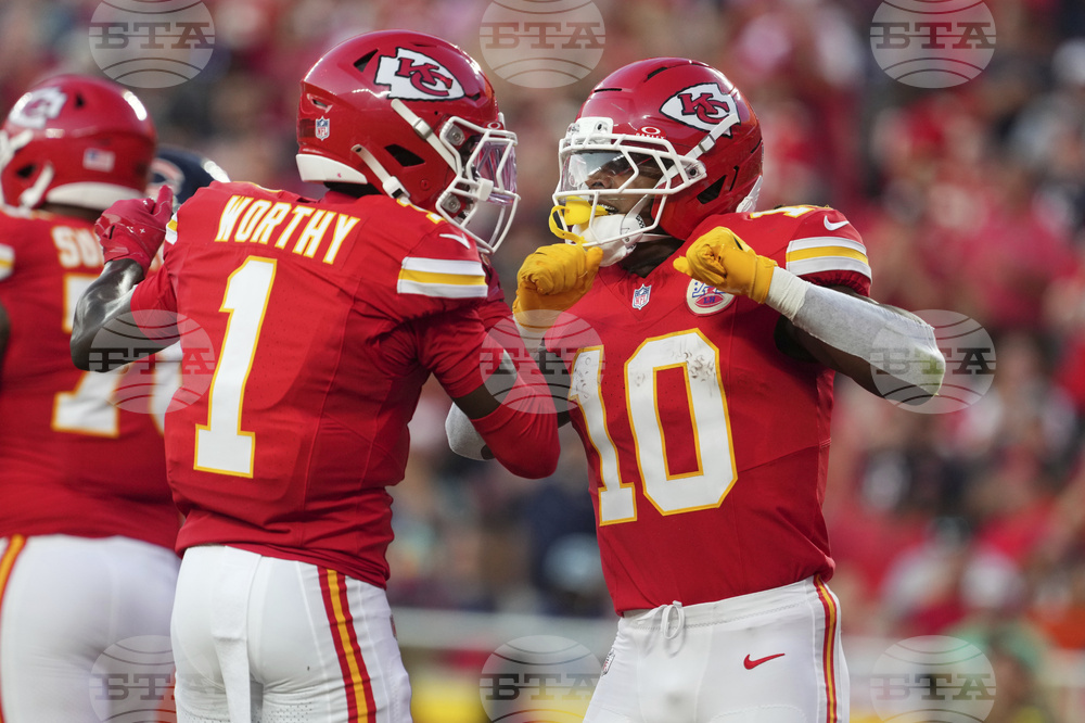 Kansas City Chiefs running back Isiah Pacheco (10) is congratulated by teammate Xavier Worthy (1) after scoring during the first half of a preseason NFL football game against the Chicago Bears Friday, Aug. 22, 2025, in Kansas City, Mo. (AP Photo/Ed Zurga)
