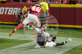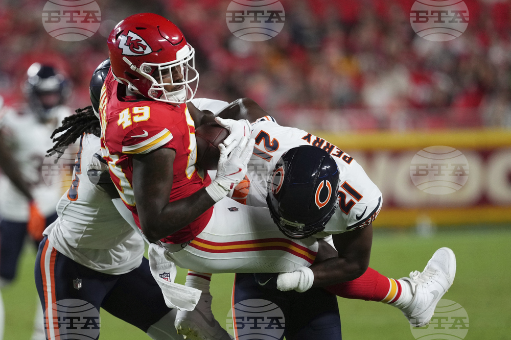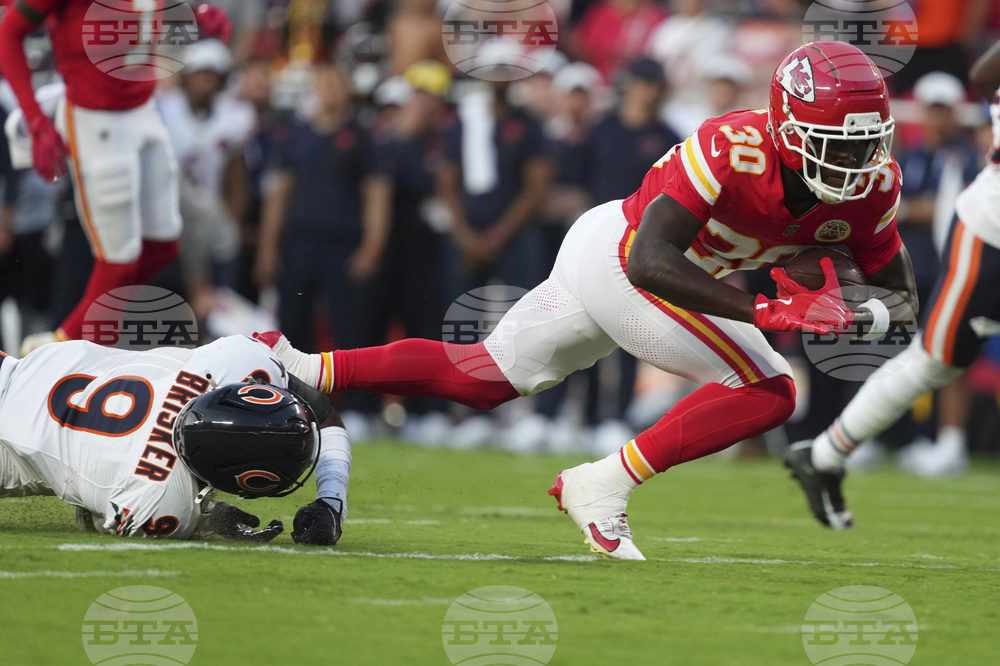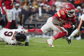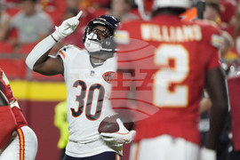 Kansas City Chiefs running back Brashard Smith (30) catches a pass as Chicago Bears defensive back Jaquan Brisker (9) defends during the first half of a preseason NFL football game Friday, Aug. 22, 2025, in Kansas City, Mo. (AP Photo/Ed Zurga)