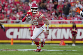Kansas City Chiefs quarterback Patrick Mahomes (15) scrambles during the first half of a preseason NFL football game against the Chicago Bears Friday, Aug. 22, 2025, in Kansas City, Mo. (AP Photo/Ed Zurga)