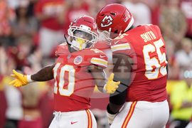 Kansas City Chiefs running back Isiah Pacheco (10) is congratulated by teammate Trey Smith (65) after scoring during the first half of a preseason NFL football game against the Chicago Bears Friday, Aug. 22, 2025, in Kansas City, Mo. (AP Photo/Charlie Riedel)
