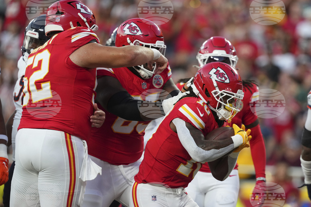 Kansas City Chiefs running back Isiah Pacheco (10) scores during the first half of a preseason NFL football game against the Chicago Bears Friday, Aug. 22, 2025, in Kansas City, Mo. (AP Photo/Ed Zurga)