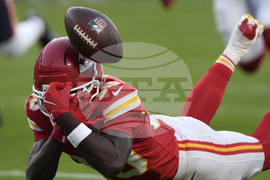 Kansas City Chiefs running back Brashard Smith is unable to catch a pass during the first half of a preseason NFL football game against the Chicago Bears Friday, Aug. 22, 2025, in Kansas City, Mo. (AP Photo/Charlie Riedel)
