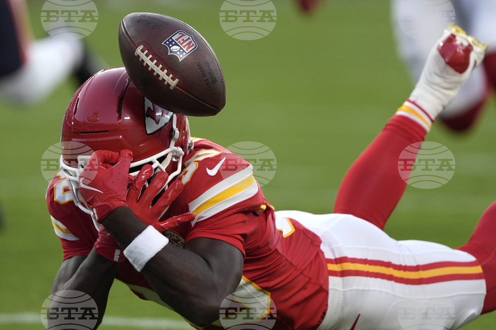 Kansas City Chiefs wide receiver Tyquan Thornton catches a 58-yard pass during the first half of a preseason NFL football game against the Chicago Bears Friday, Aug. 22, 2025, in Kansas City, Mo. (AP Photo/Charlie Riedel)