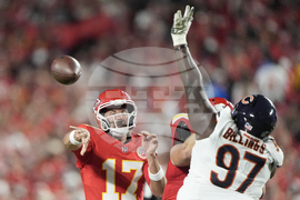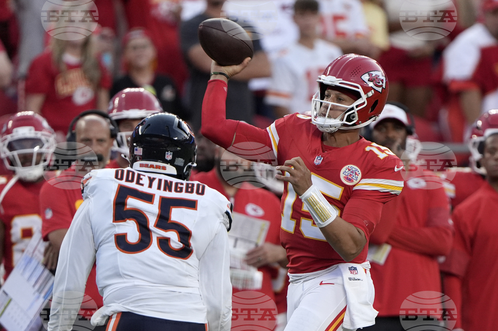 Kansas City Chiefs quarterback Patrick Mahomes (15) throws over Chicago Bears defensive lineman Dayo Odeyingbo (55) during the first half of a preseason NFL football game Friday, Aug. 22, 2025, in Kansas City, Mo. (AP Photo/Charlie Riedel)