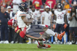 Chicago Bears wide receiver DJ Moore (2) catches a pass as Kansas City Chiefs defensive back Jaden Hicks (21) defends during the first half of a preseason NFL football game Friday, Aug. 22, 2025, in Kansas City, Mo. (AP Photo/Ed Zurga)
