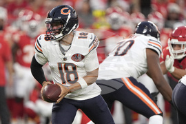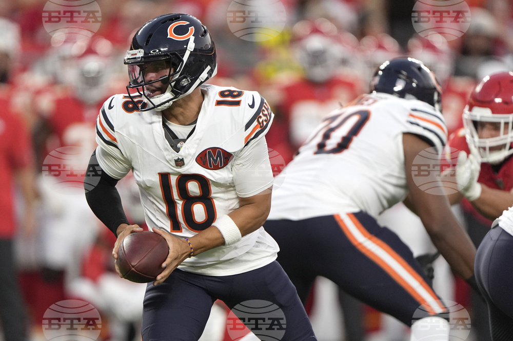 Chicago Bears quarterback Caleb Williams (18) looks to hand off during the first half of a preseason NFL football game against the Kansas City Chiefs Friday, Aug. 22, 2025, in Kansas City, Mo. (AP Photo/Charlie Riedel)