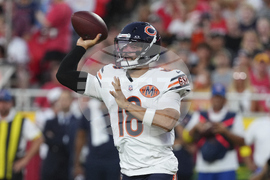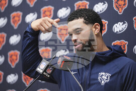 Chicago Bears quarterback Caleb Williams speaks during a news conference following a preseason NFL football game against the Kansas City Chiefs Friday, Aug. 22, 2025, in Kansas City, Mo. (AP Photo/Ed Zurga)