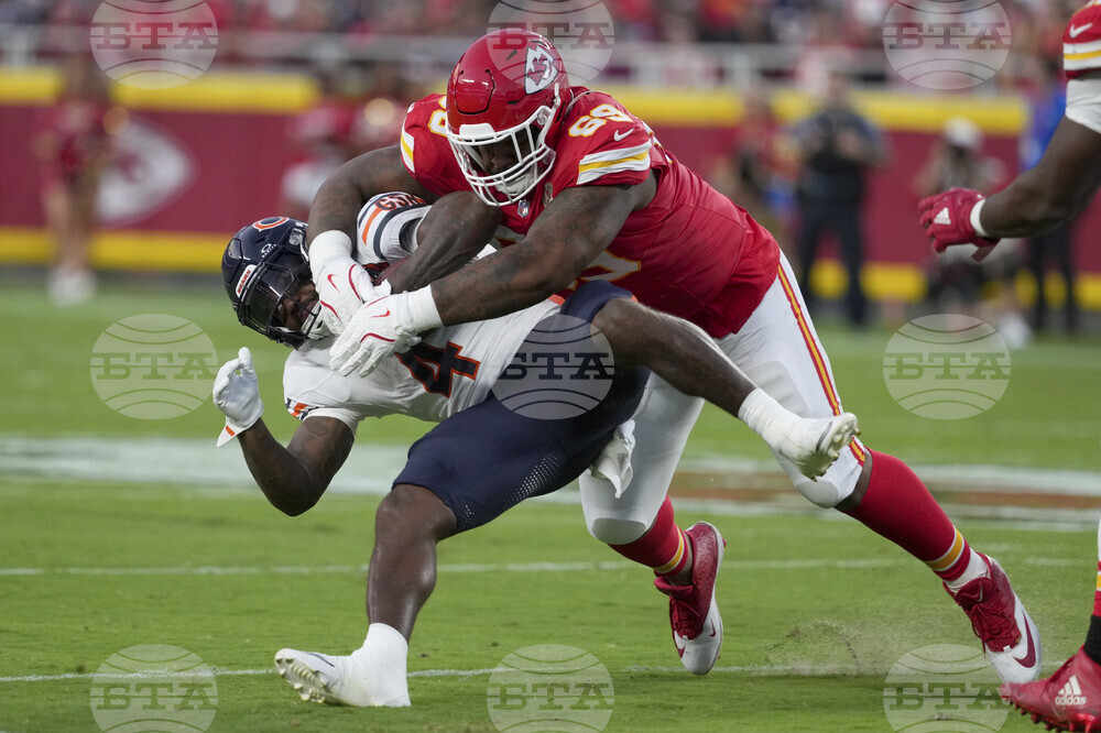 Chicago Bears running back D'Andre Swift (4) is stopped by Kansas City Chiefs nose tackle Mike Pennel (69) during the first half of a preseason NFL football game Friday, Aug. 22, 2025, in Kansas City, Mo. (AP Photo/Ed Zurga)
