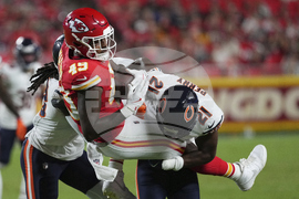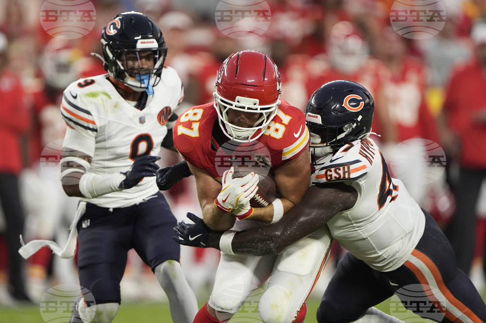Kansas City Chiefs tight end Travis Kelce (87) is stopped by Chicago Bears linebacker Ruben Hyppolite II, right, as defensive back Jaquan Brisker (9) watches during the first half of a preseason NFL football game Friday, Aug. 22, 2025, in Kansas City, Mo. (AP Photo/Charlie Riedel)